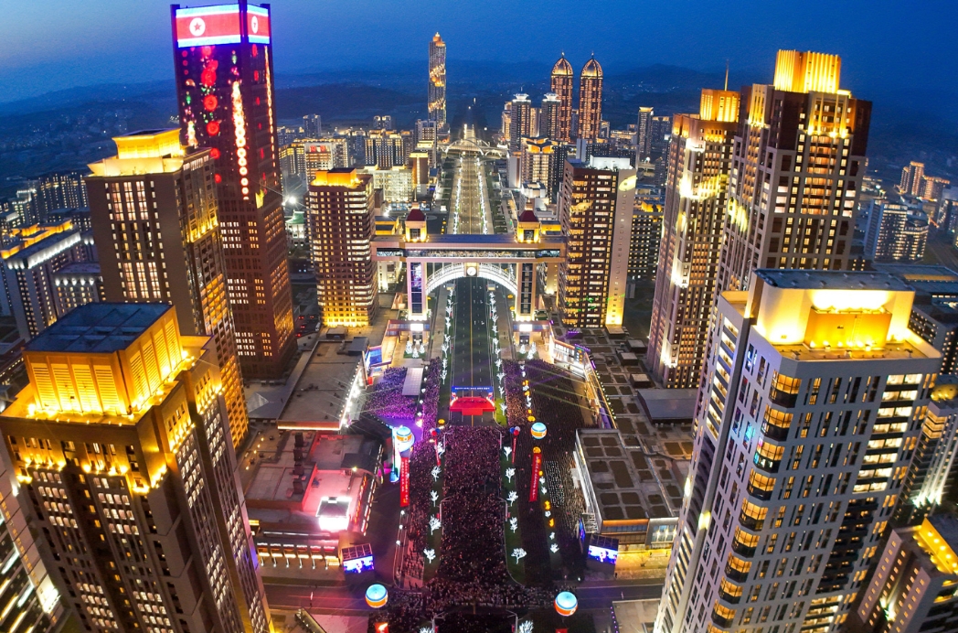 明るく照らされた平壌の近代的街並み